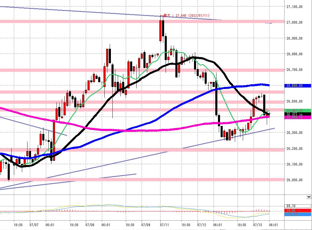 2022年07月13日 日経225先物 ナイトの値動きと寄り付き前のチャート分析 7月13日 皆様、お早うございます。とりあえずナイトに若干上昇しております。上昇と言っても、75本移動平均線(青)手前で売られて下落も、とりあえずプラス。25本移動平均線(黒)もまだ、下向きのまま。日足でも、現状は上髭陽線です。ただし、主要な移動平均線の下です。5日移動平均線と25日移動平均線を超えていきたいところ。 カテゴリなしの他の記事 < 前の記事次の記事 > コメント コメントフォーム 名前 コメント 記事の評価 リセット リセット 顔 星 情報を記憶 コメントを投稿する