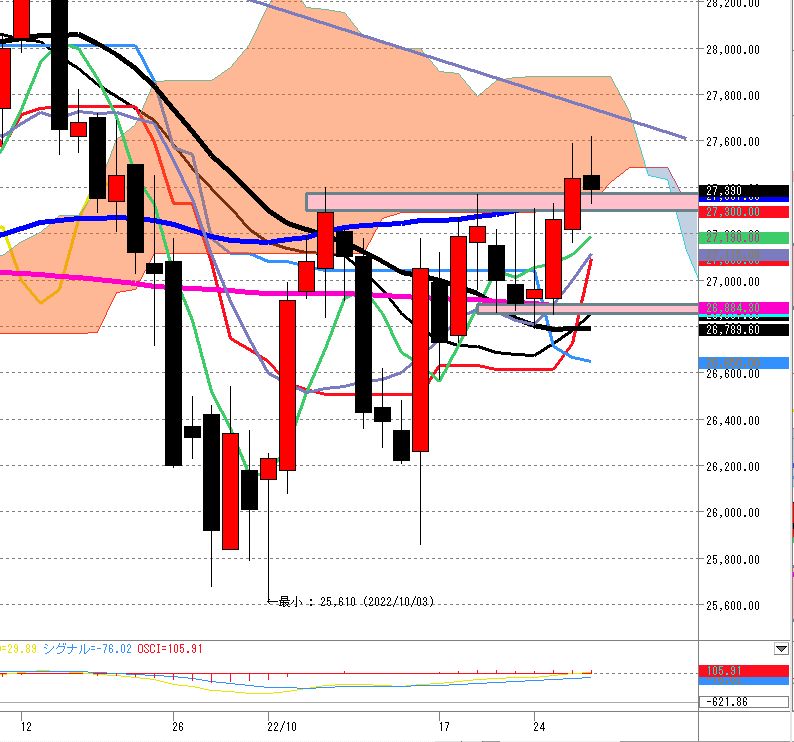 2022年10月27日 日経225先物 前場の値動きとチャート分析 10月27日 皆様、お疲れ様です。重いですね。。。では、チャート分析です。ご自分の時間軸に合わせて取引の参考にして下さい。まずは、5分足です。やっと、25本移動平均線(黒)の上に乗ったと思っても、、、75本移動平均線(青)を超えられずにまた下落。次に1時間足です。右3本です。下のゾーンで買われてはおりますが、上へ行けない。最後に日足です。現状長い上ヒゲ陰線です。上ヒゲ2連発は避けたいところ。 カテゴリなしの他の記事 < 前の記事次の記事 > コメント コメントフォーム 名前 コメント 記事の評価 リセット リセット 顔 星 情報を記憶 コメントを投稿する