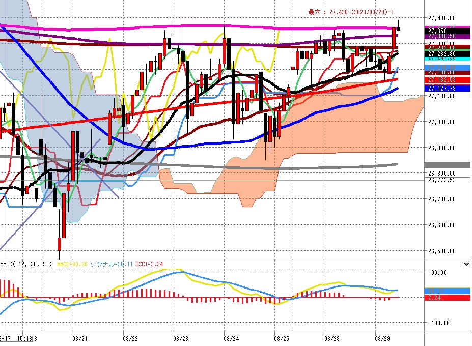 25本移動平均線(黒)の上、75本移動平均線(青)の上です。