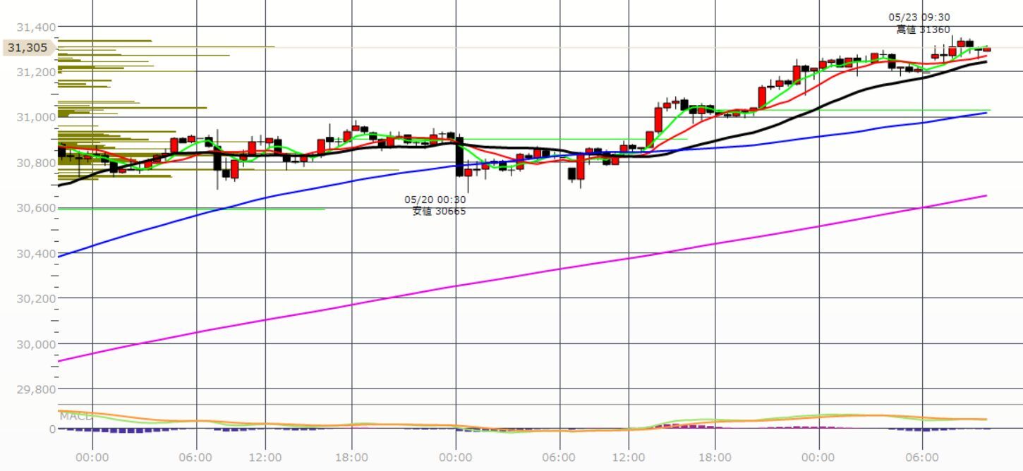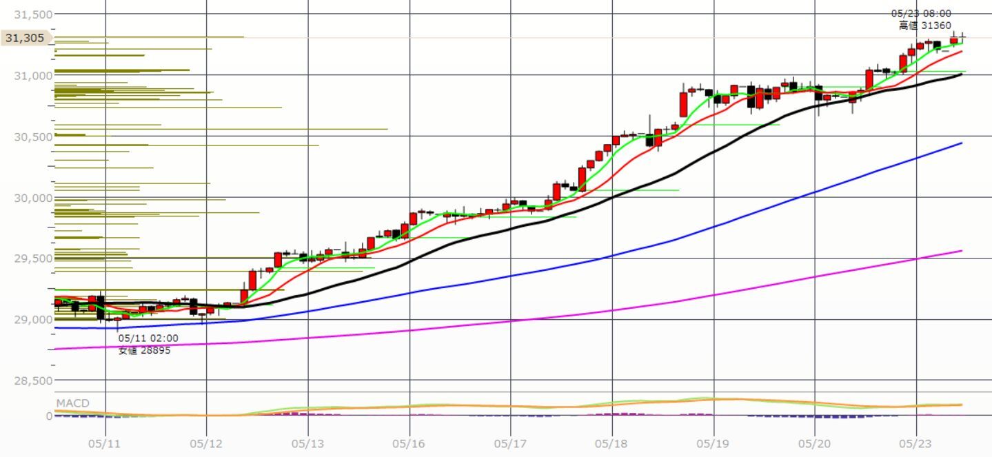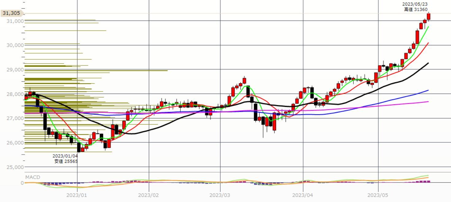 何だかんだで、まだ25本移動平均線(黒)の上です。