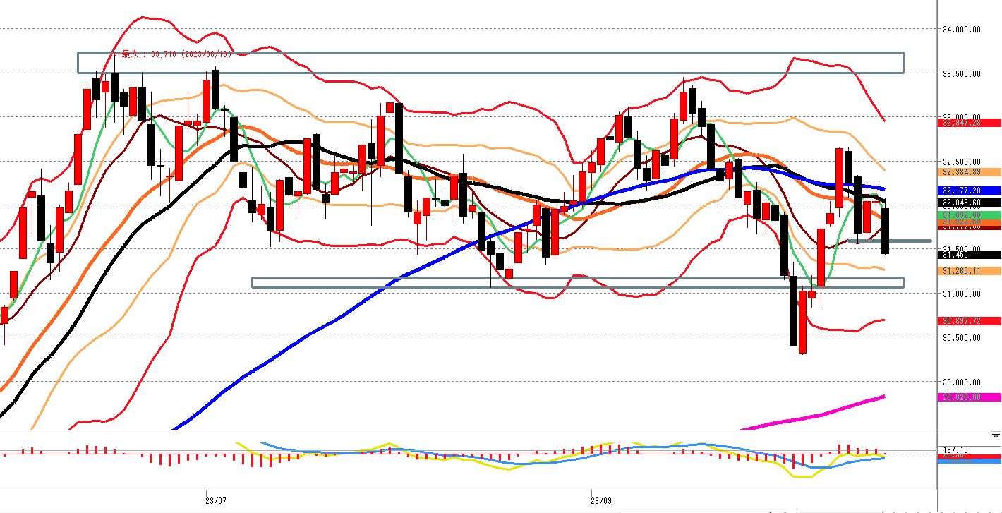 ダブルボトム、逆三尊などで25本移動平均線(黒)を超えたら買い転換を考える。
