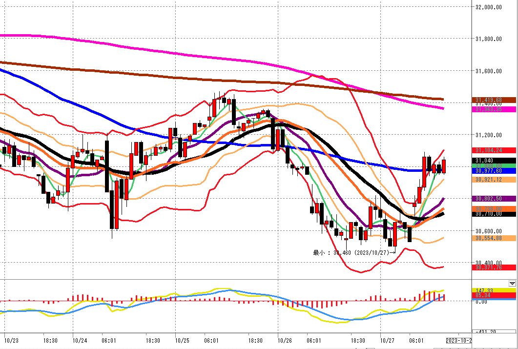 75本移動平均線(青)が、下向きで迫って来ております。