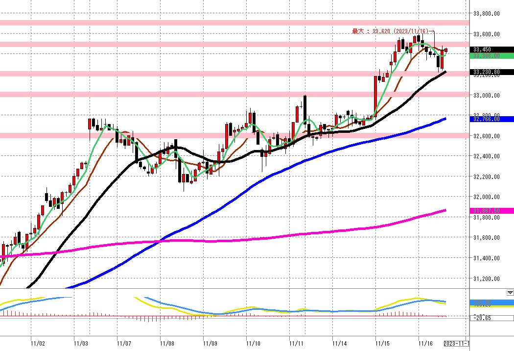 何だかんだで、25本移動平均線(黒)で押し目が入った形。