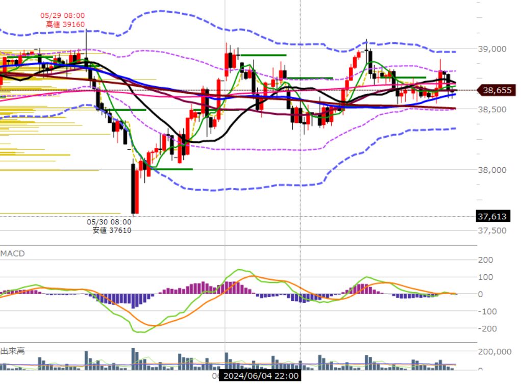 25本移動平均線(黒)を割ったら、買いは枚数を減らす、売りに転換するなどを検討しましょう。