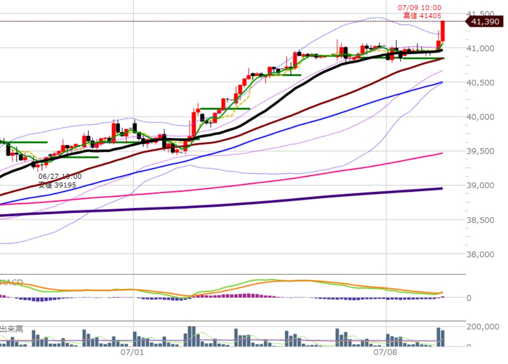 25本移動平均線(黒)を割ったら、買いは枚数を減らす、売りに転換するなどを検討しましょう。