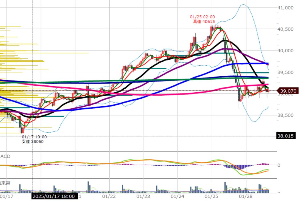 下落から、25本移動平均線(黒)が波打ちしだしたら底値圏の乱高下を想定しましょう。