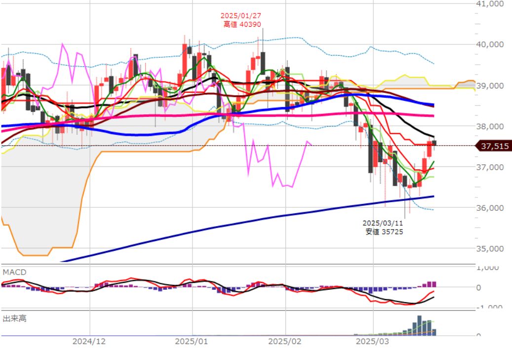 下落から、25本移動平均線(黒)が波打ちしだしたら底値圏の乱高下を想定しましょう。