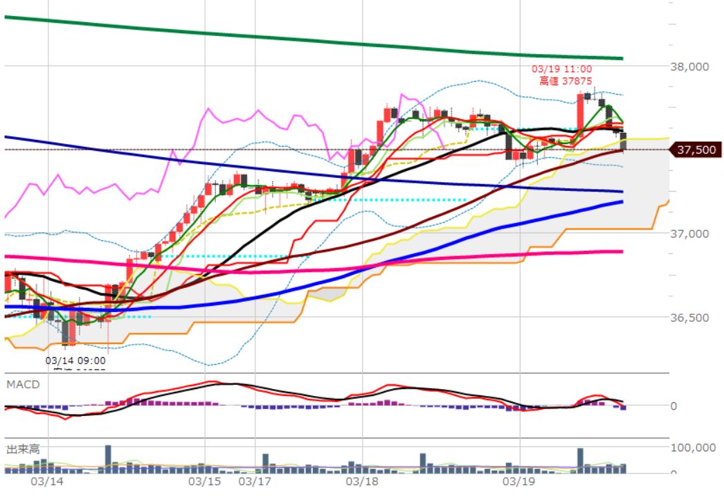 まずは、1時間足です。ごく単純に25本移動平均線(黒)の上は買い、下は売り。