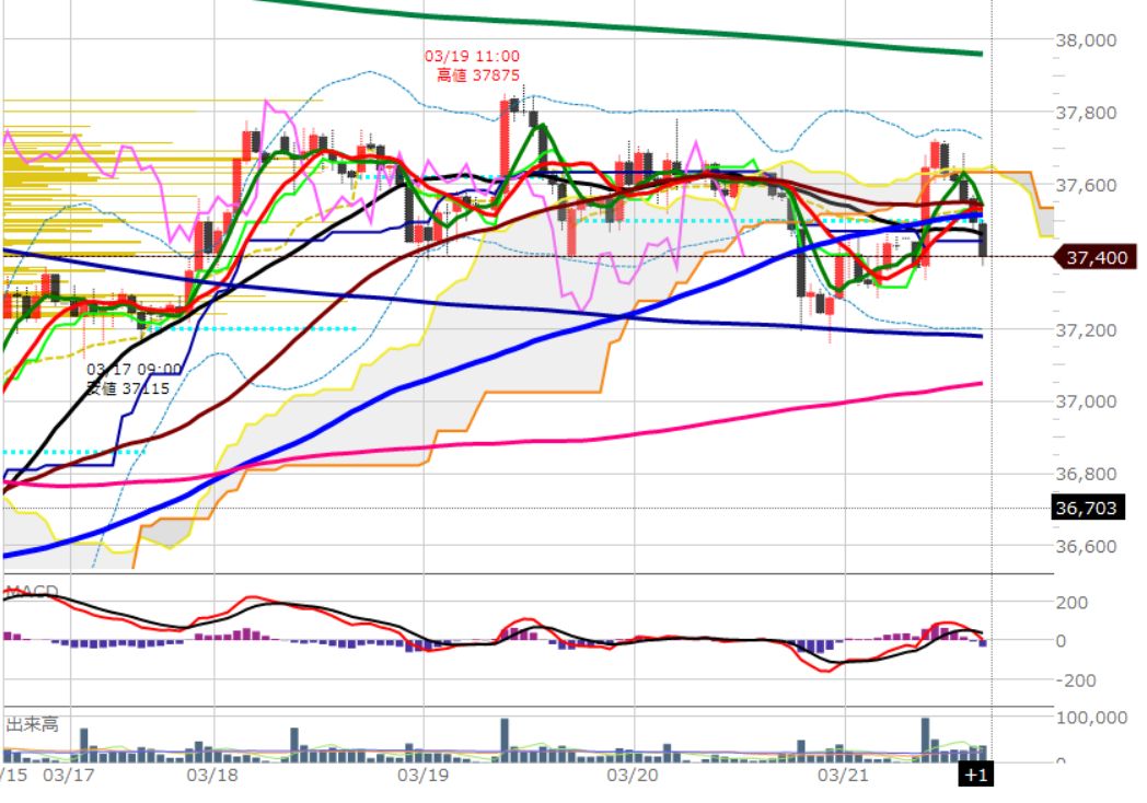 まずは、1時間足です。ごく単純に25本移動平均線(黒)の上は買い、下は売り。