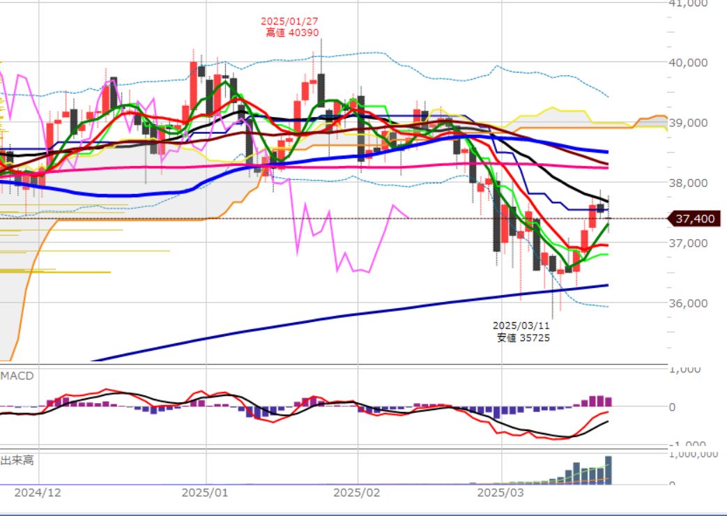 下落から、25本移動平均線(黒)が波打ちしだしたら底値圏の乱高下を想定しましょう。