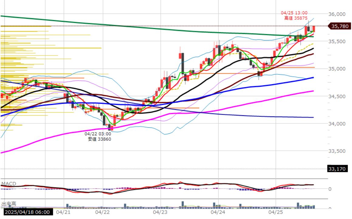 まずは、1時間足です。ごく単純に25本移動平均線(黒)の上は買い、下は売り。