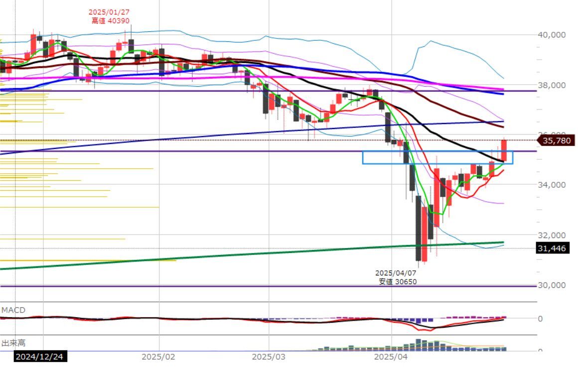 下落から、25本移動平均線(黒)が波打ちしだしたら底値圏の乱高下を想定しましょう。