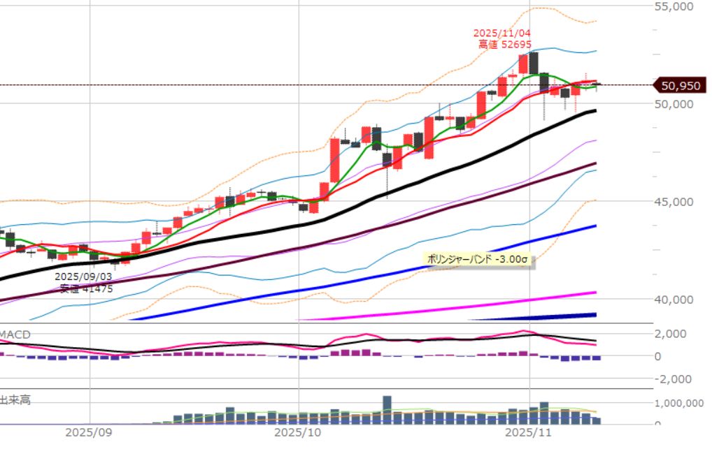 細かくは25本移動平均線(黒)の上は買い。下は売り。
